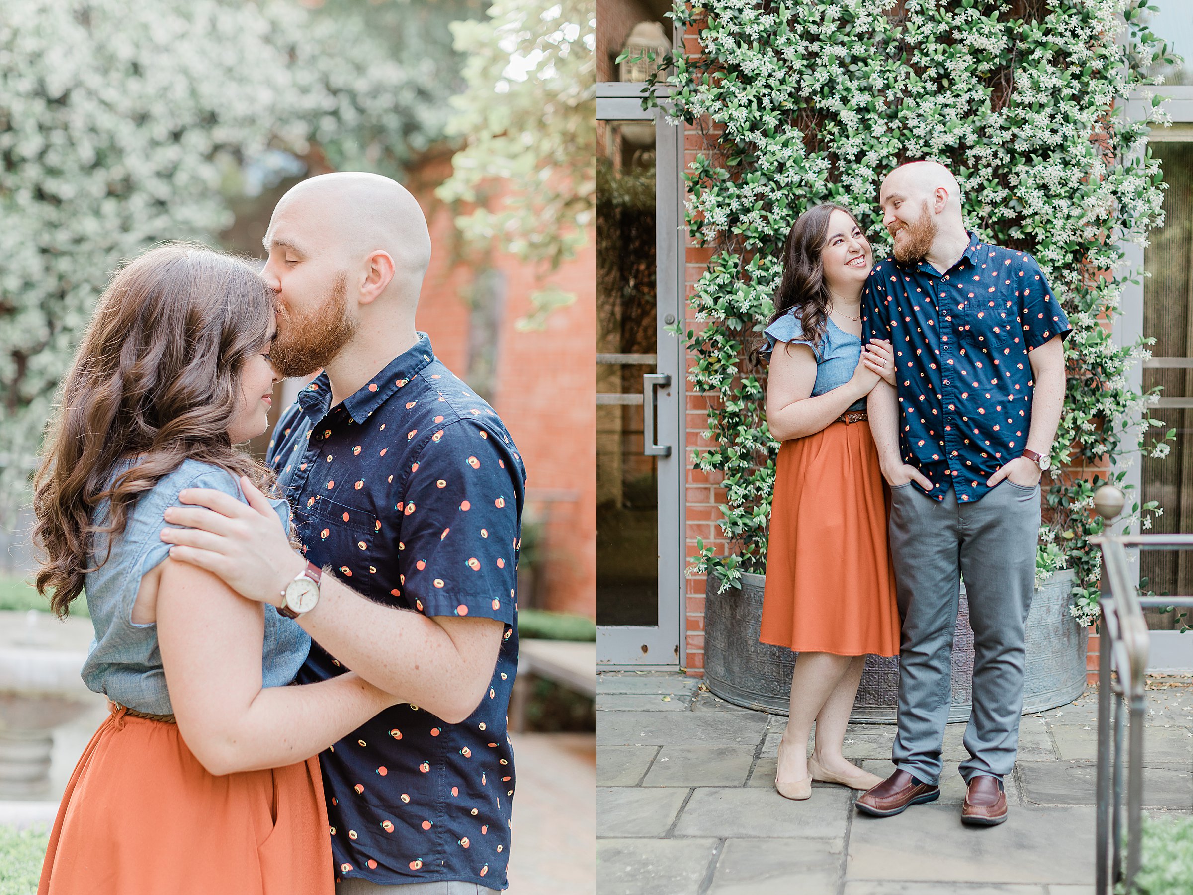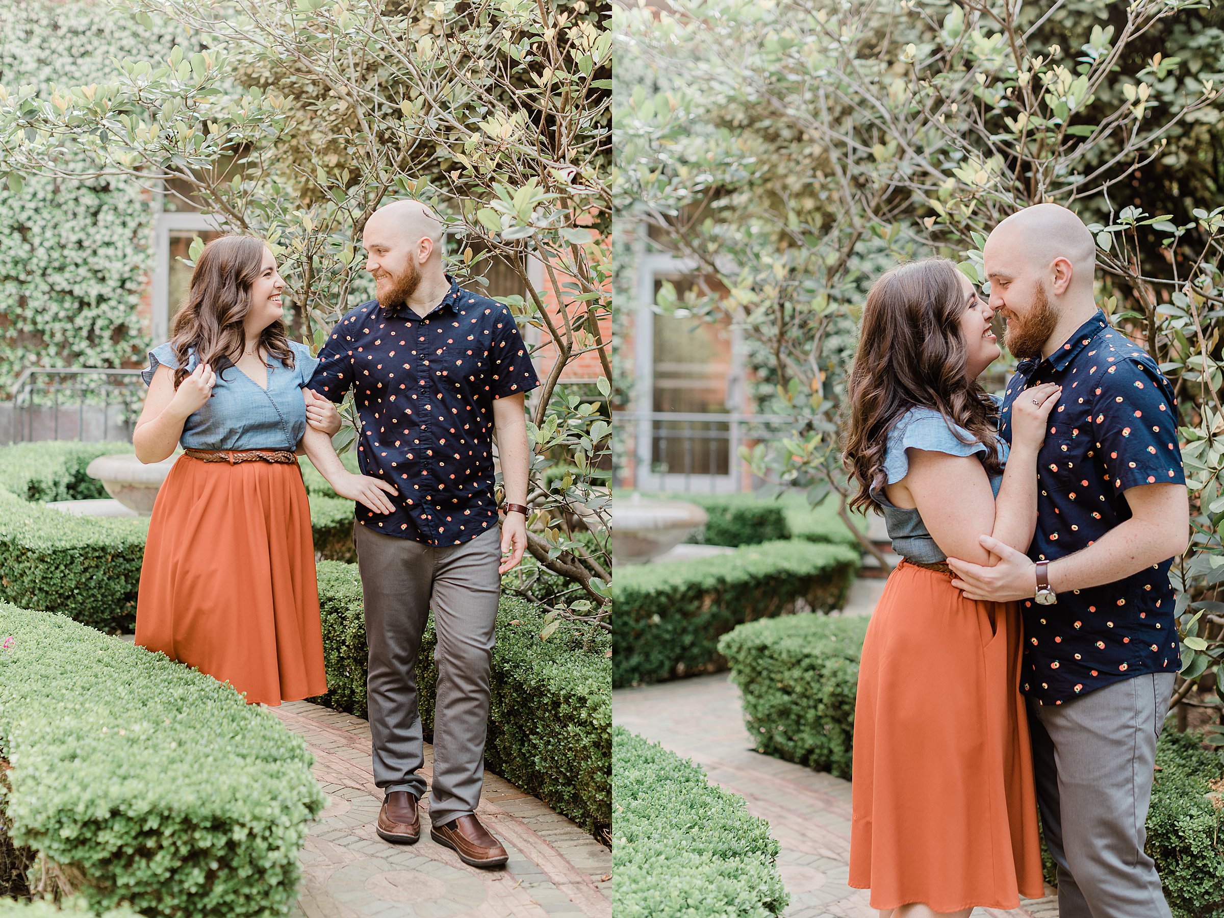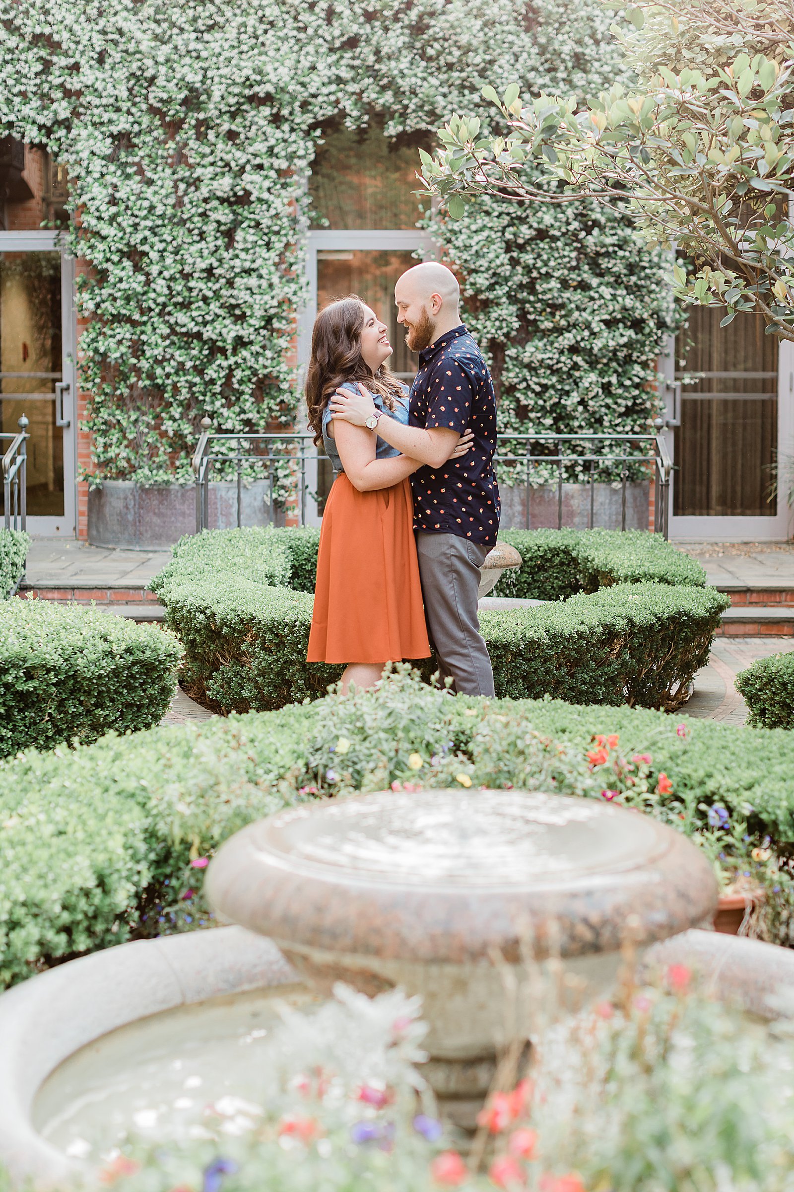 Becca and Peter celebrated their engagement with a Trinity University Summer engagement session, followed by some gorgeous portraits at The Witte Museum! I absolutely loved working with Becca and Peter and having a tour of Trinity University where their love story began! It’s a gorgeous campus in the heart of San Antonio, and the outfits they chose (especially Becca’s burnt orange skirt) fit perfectly with the scenery. Trinity University boasts gardens, water features and beautiful oak trees. My favorite spot was a real life secret garden. Complete with a heavy door and inconspicuous exterior. I love when couples show me their favorite spots in the city and trust me to create gorgeous images for them!