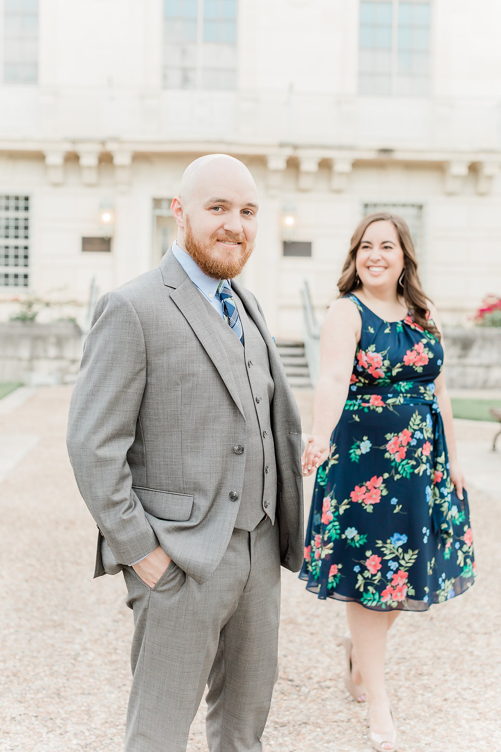After exploring the university, we headed to The Witte Museum. Just a few minutes from the campus, the detailed buildings and gardens lend themselves to the elegant vibe of the second half of our session. Becca’s navy dress complimented Peter’s dapper gray suit perfectly. Don’t they just look amazing together? And if there’s ever a question to bring champagne or not…please, bring the champagne! Toasting to your engagement is one of the most fun things we can do at your session!