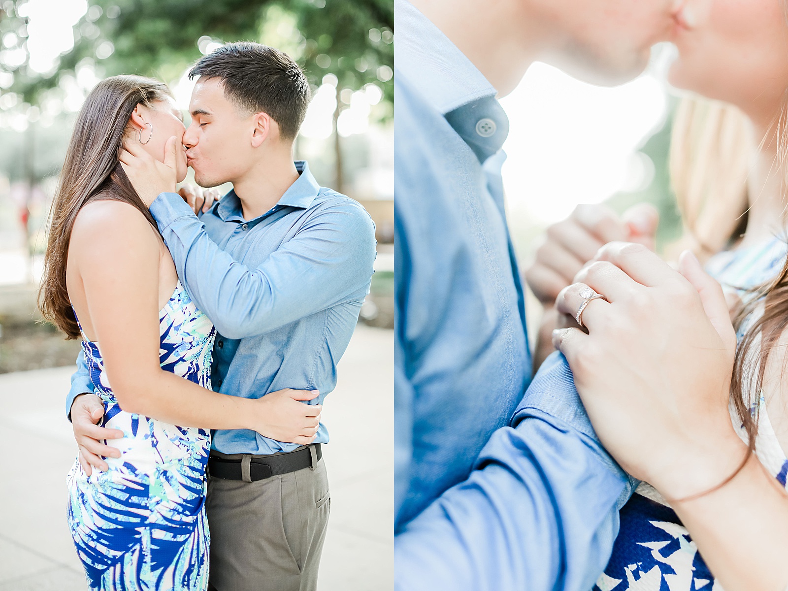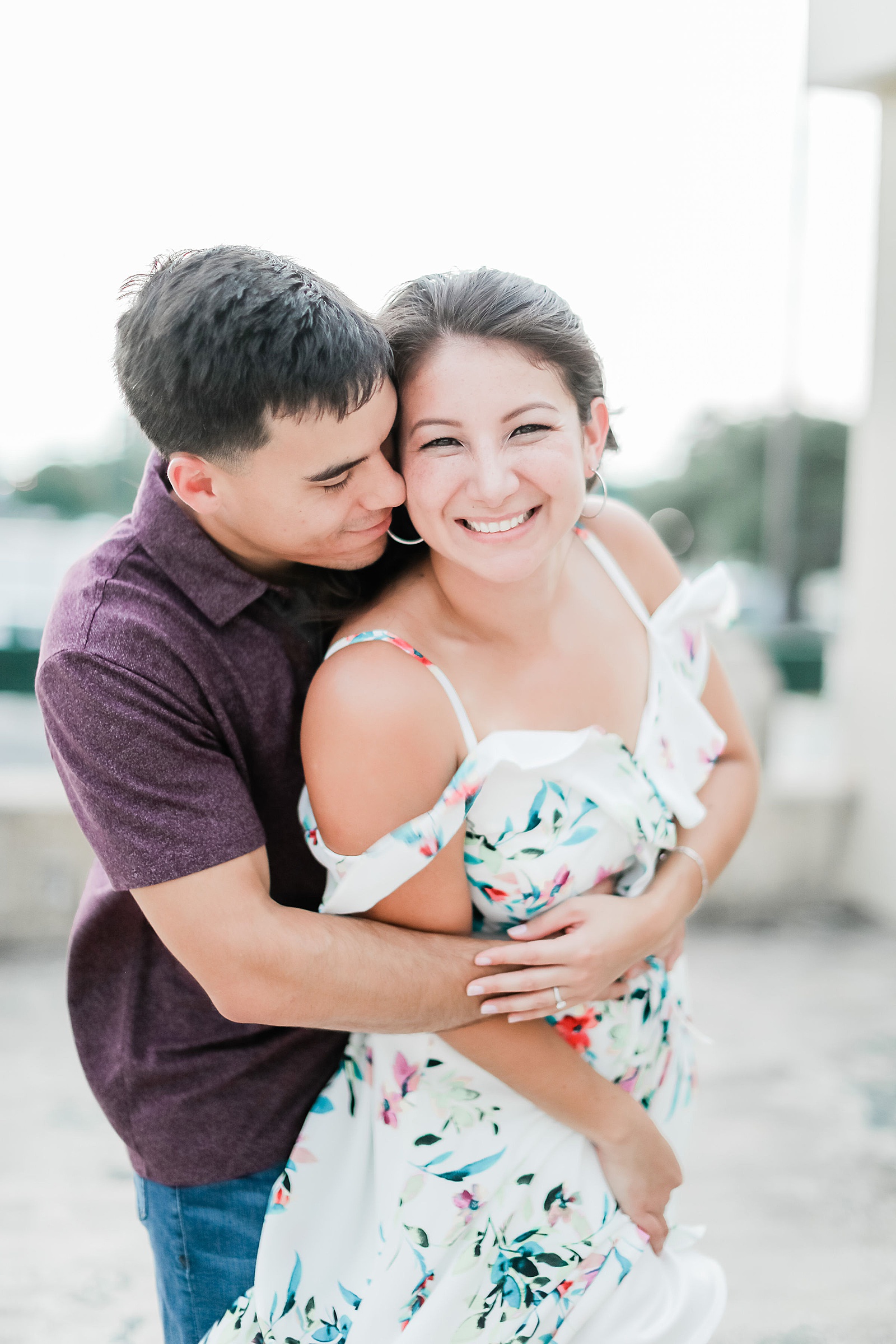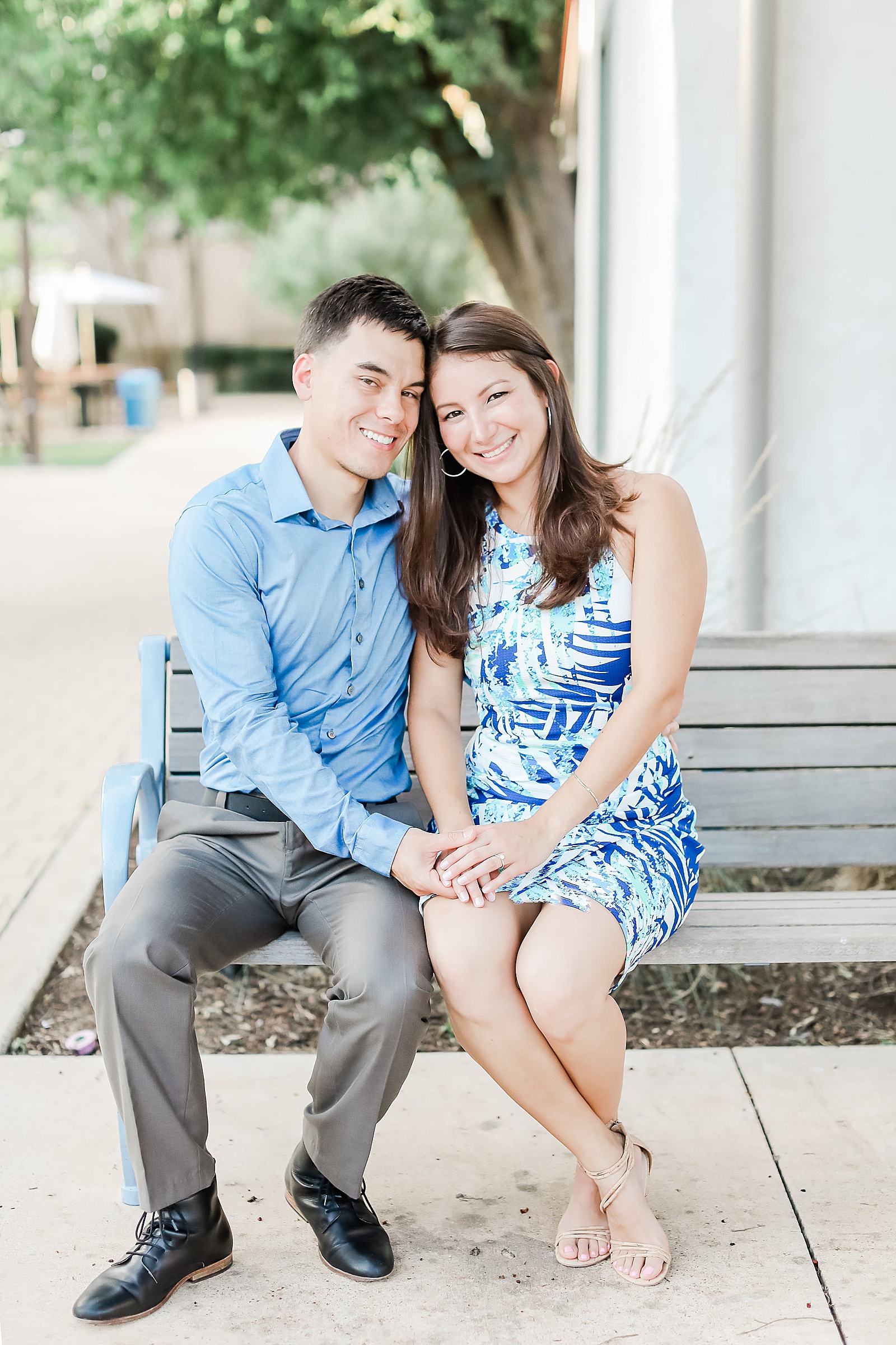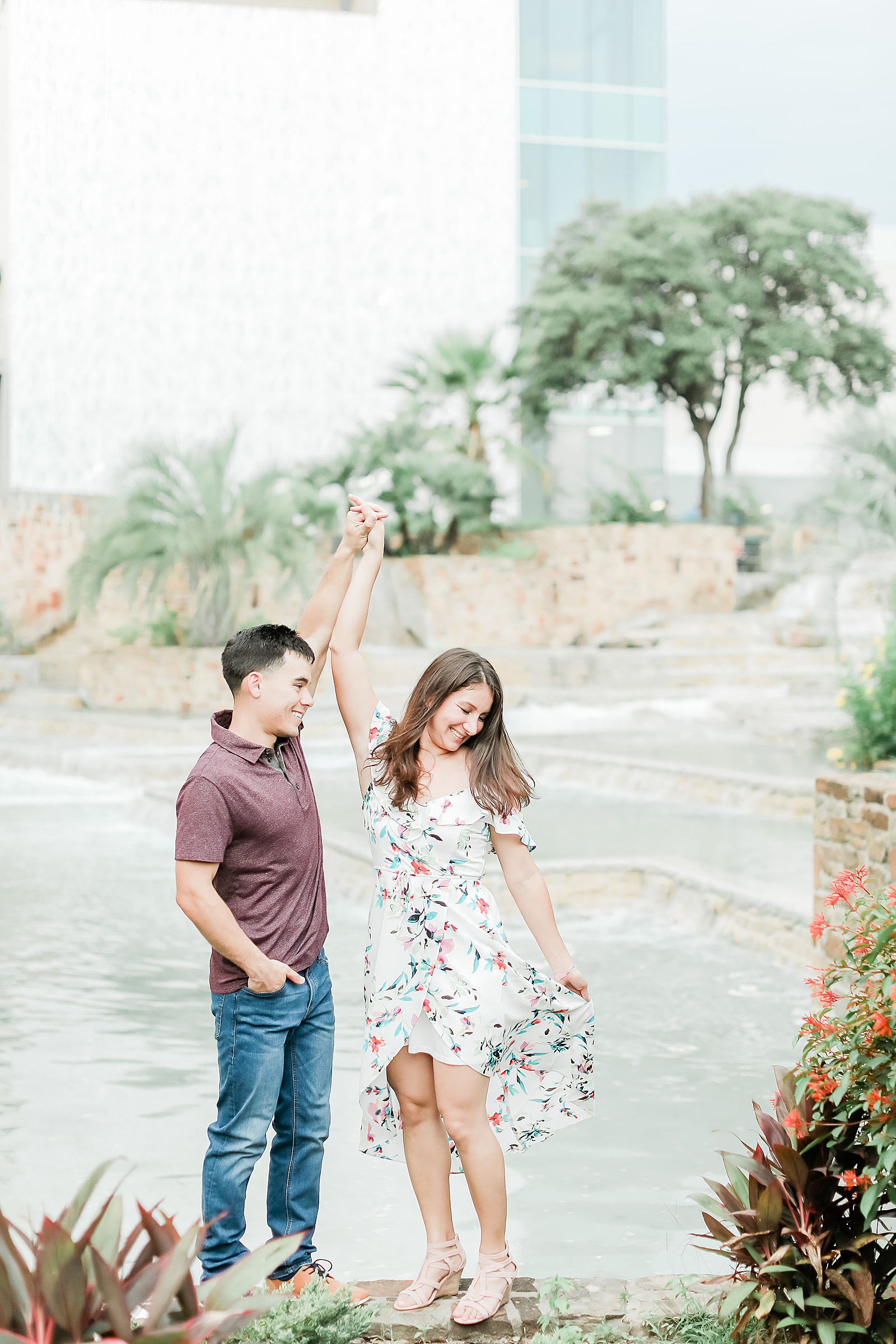 Hemisfair park is in the heart of San Antonio and while we frequent it for kids activities, I hadn’t had the chance to explore the far side around the Tower of Americas. It absolutely did not disappoint! With fountains, beautiful architecture and a resort vibe, it made the perfect backdrop for Ana and David’s summer engagement session! Ana ‘s flirty dresses were such a great choice for this location too! And with the wind we had, she didn’t even have to try to really twirl! For the second time, my clients and I unknowingly were shooting during a tornado watch! But, that’s another story!