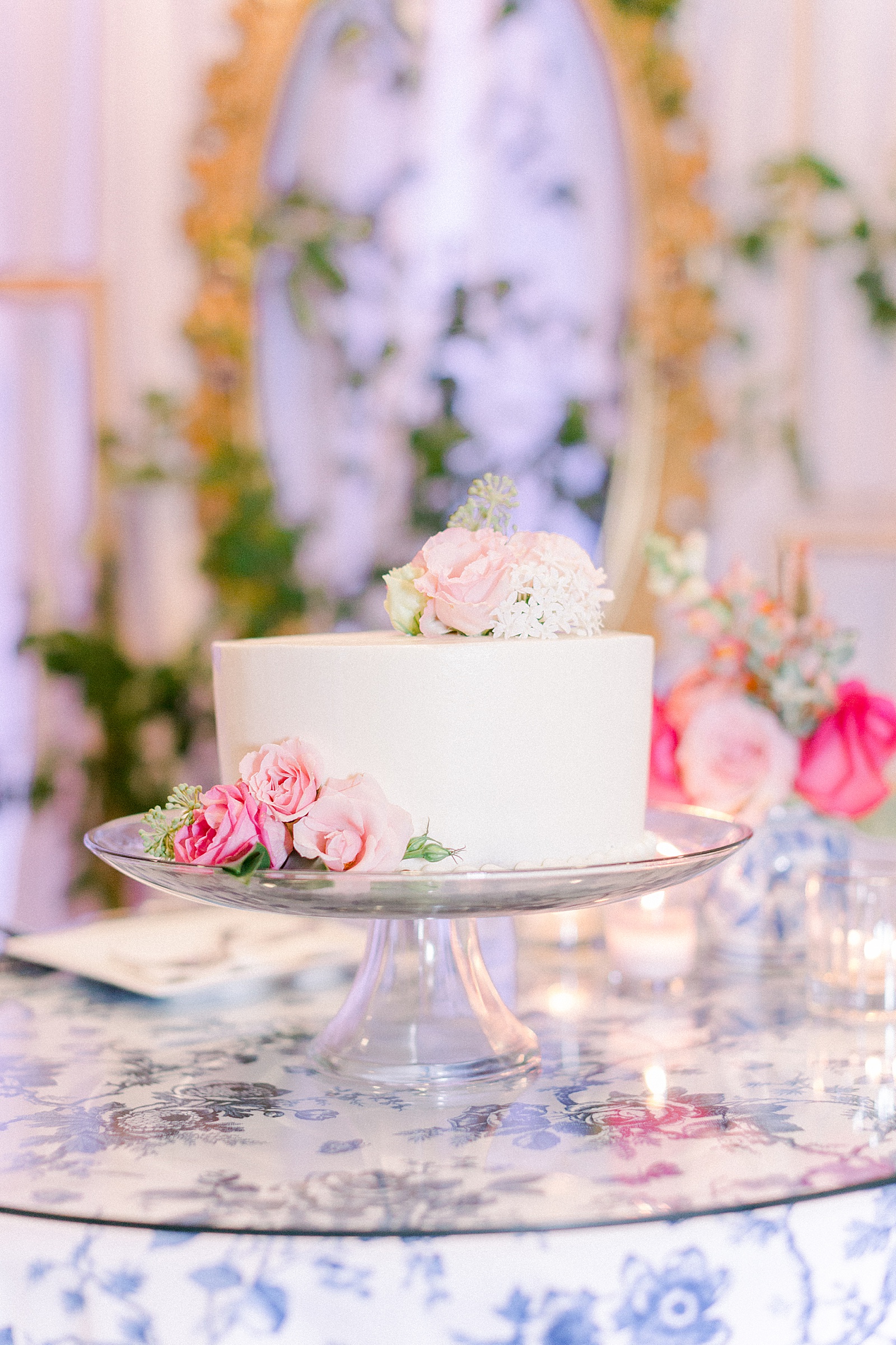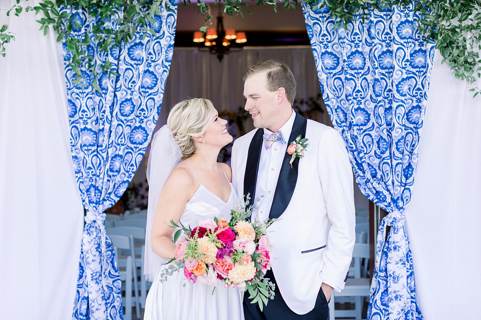 Ann Spencer and Austin chose a classic blue and white color scheme to be the base palette for their day. Against the white backdrop of the Olde Providence Racquet Club it stood out in the best way! The array of pink, gold and berry colored florals popped in contrast to the bridesmaids white gowns and the groomsmen classic tuxes. Blue and white linens and tapestry accented with gorgeous greenery and gold touches graced the venue to create a chic and preppy vibe. The lounge areas with couches, cozy throw pillows and tall tables encouraged guests to gather and chat while enjoying the aesthetic.