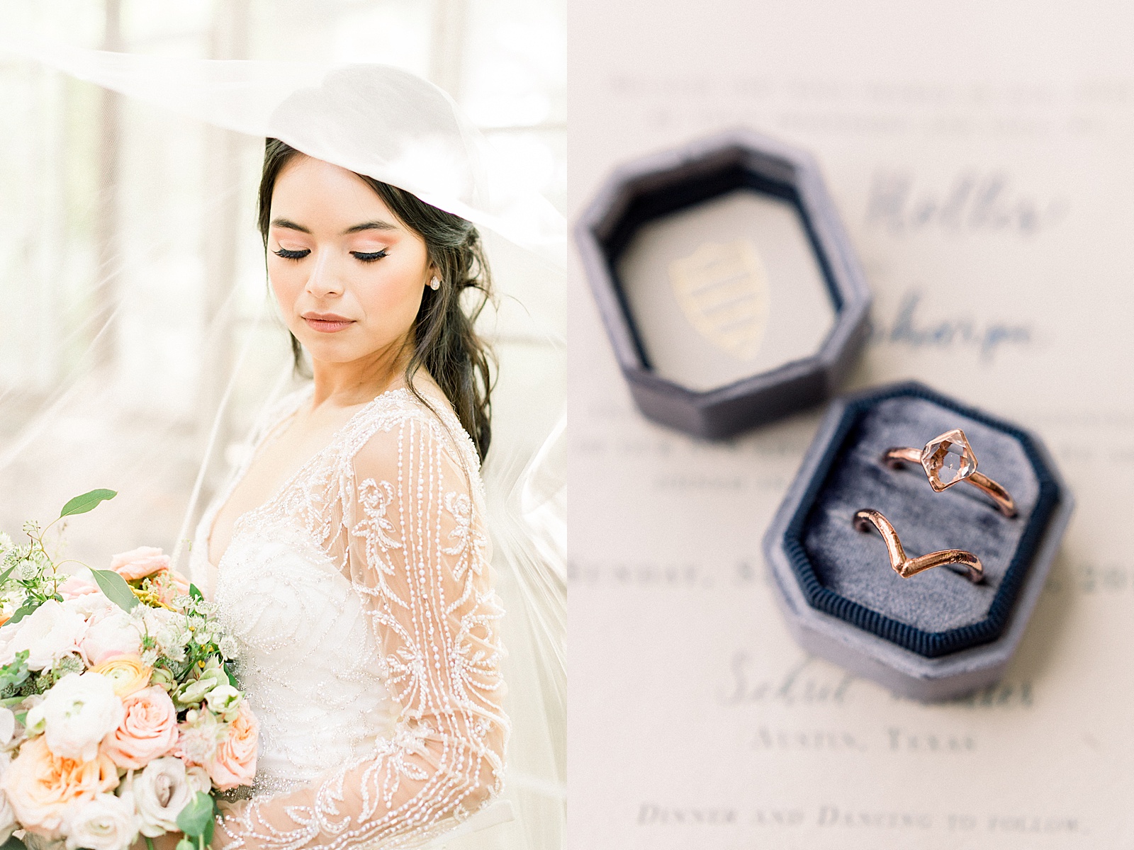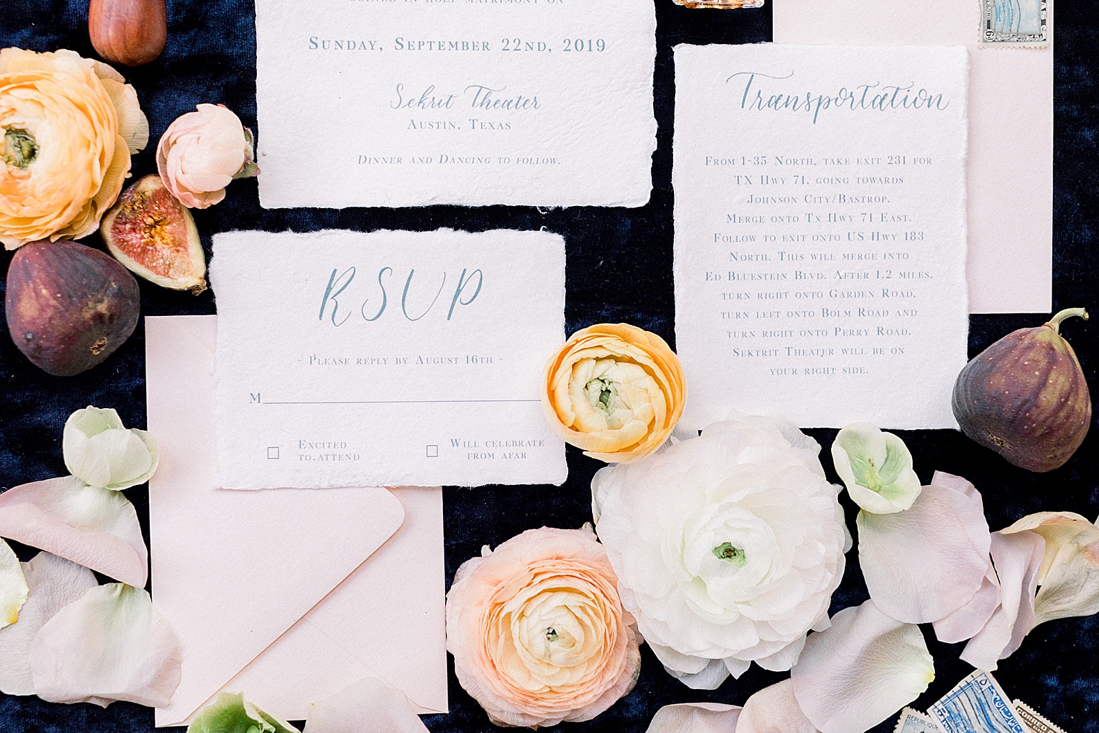 Our shoot features jewel toned velvets, cathedral veils and handprinted desserts. A table filled with decadent personal chartucerie plates and delicious fall inspired drinks. Raw gemstones jewelry gave a unique twist to the style of the day that was perfect for this Austin venue. Calligraphy was featured on invitations of handmade papers with dried fruit tying them together. Additionally, our models hair and makeup accented their natural beauty without being over the top (which is just the way it should be for your wedding day)!