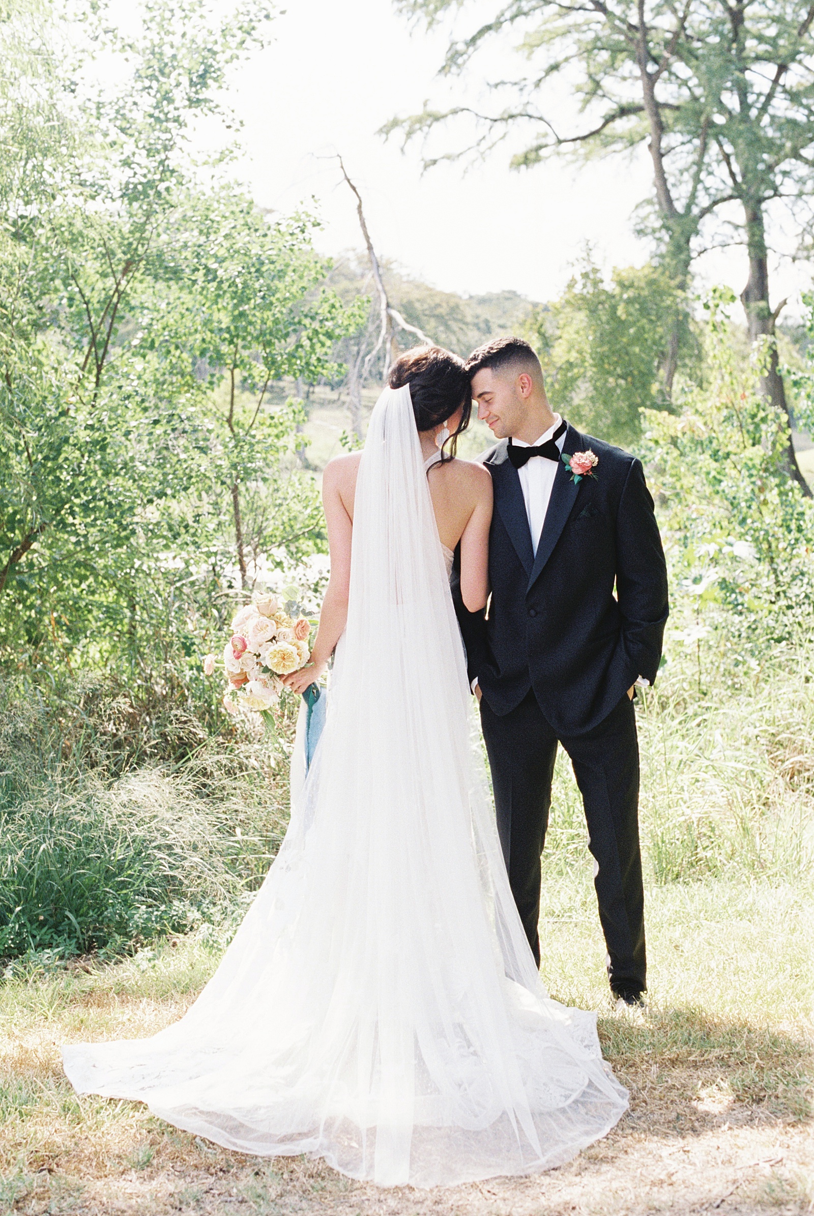 It was a warm day on the river, but with a breeze that made the day perfect for an outdoor ceremony and al fresco dining. The bride wore a stunning Marchesa gown with intricate details and the groom wore a classic tux topped with a bowtie. Against the pale greens and soft cream rocks the colorful florals popped and added some whimsy and brightness to the day. This Hill Country wedding inspiration is perfect for any season, but especially beautiful for a spring wedding.
