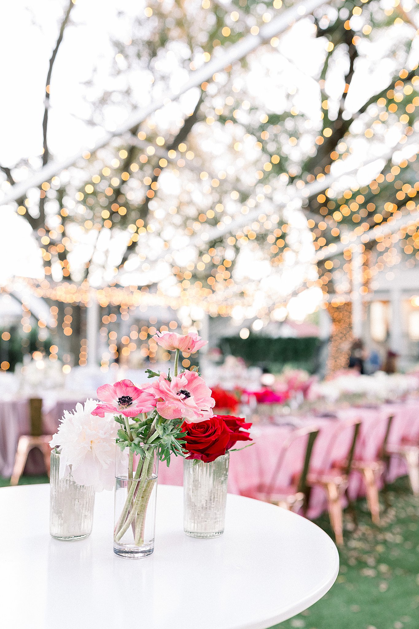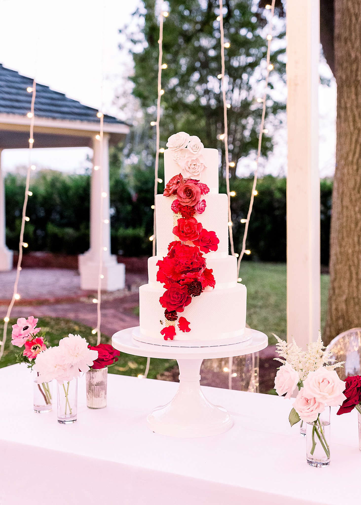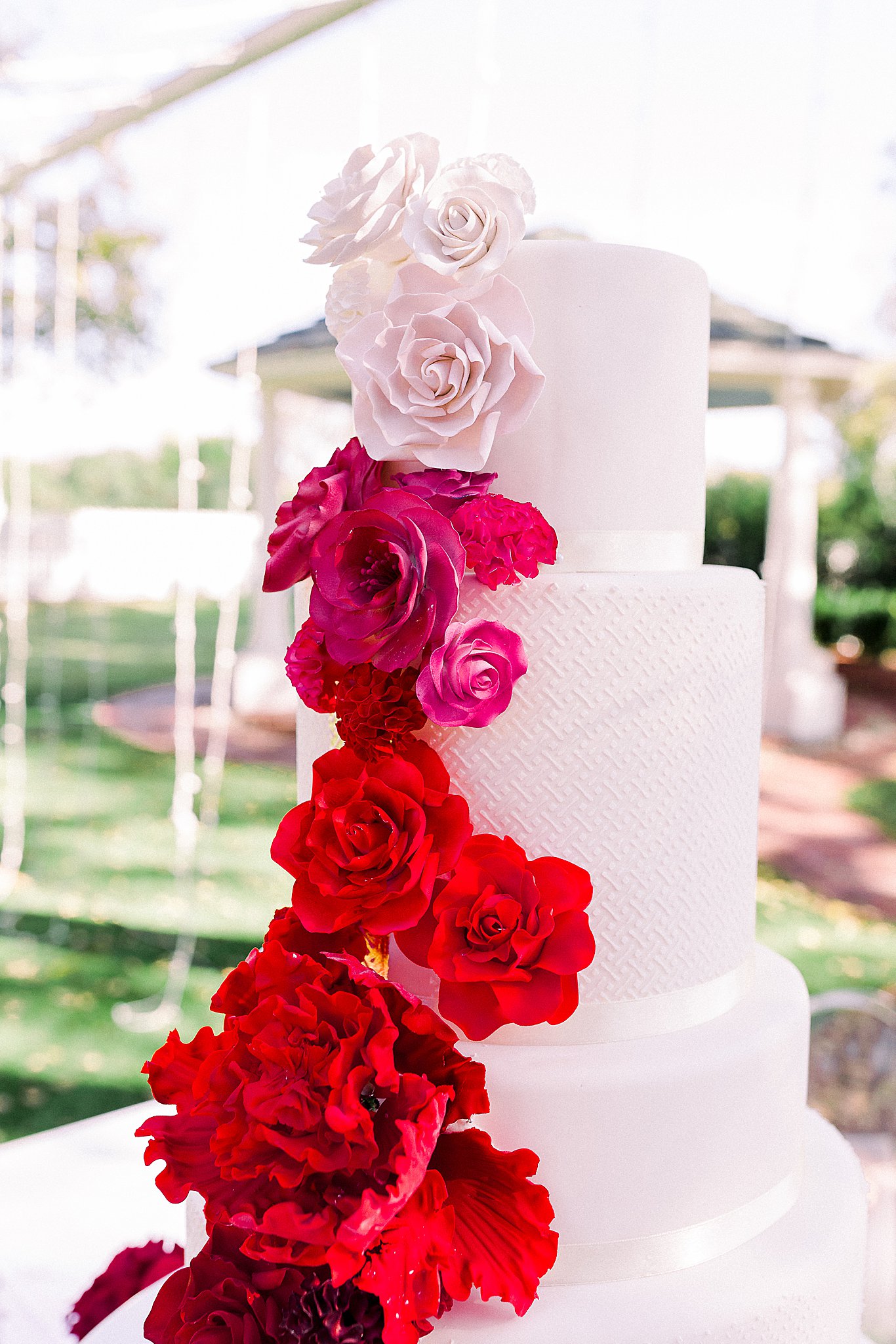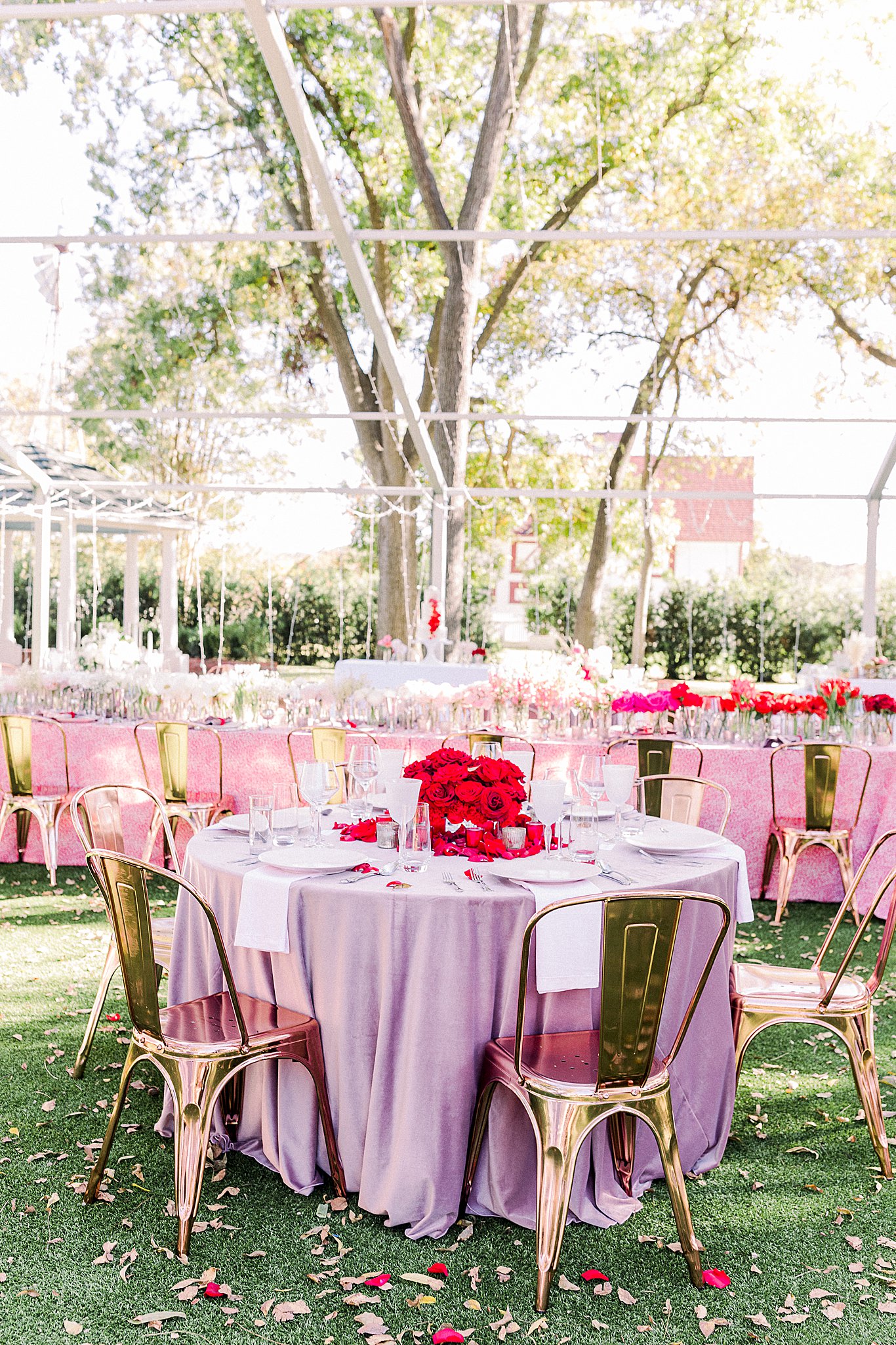 For this event, the outdoor reception space was set with a mix of family-style tables and smaller round tables allowing guests to choose their wedding experience. The tables were designed with bold red to pink ombre floral centerpieces. The mix of florals made the tables inviting and visually stunning.