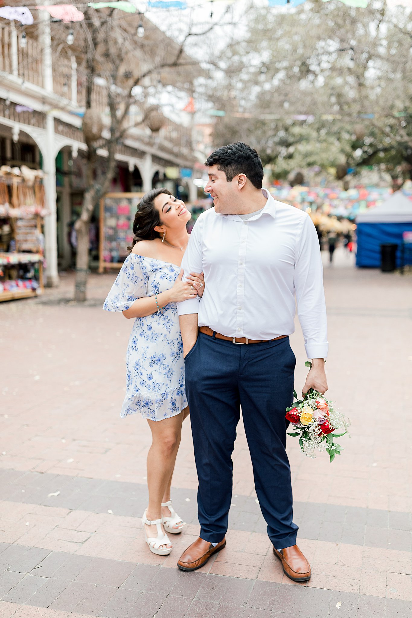 Our session started at the Historic Market Square in downtown San Antonio. It’s a place that the couple loves, and the colors and energy there lends itself to a lighthearted and fun photoshoot. We made use of the textures and hues to frame the couple in their happy place. Sarah and Mario were a joy to explore with. The Historic Market is a gem for photoshoots, I’m so glad they chose this as their starting point!