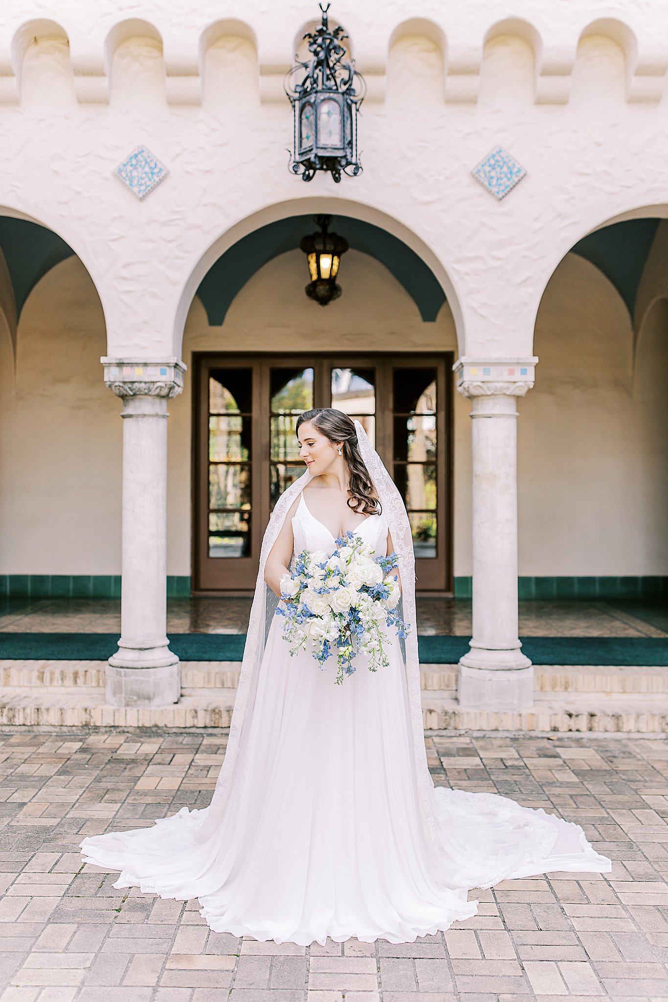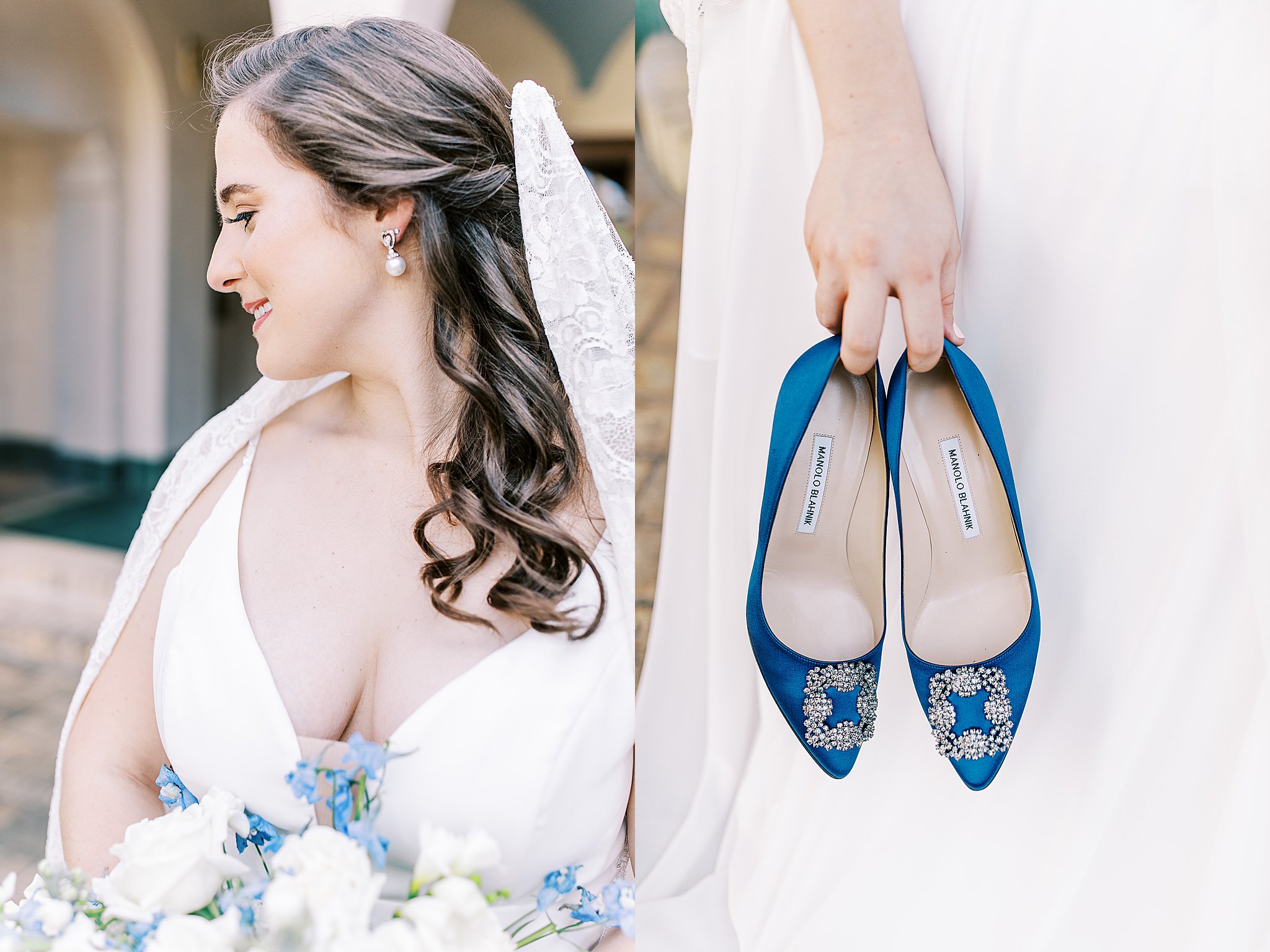 The blue Manolo Blahnik’s Fontaine chose were the most beautiful something blue for her day. Featuring the classic Manolo square gem detail and a still walkable heel, they truly are some of the best bridal shoes. It was also fun to see them against the bright background of the Spanish tiles at The McNay!