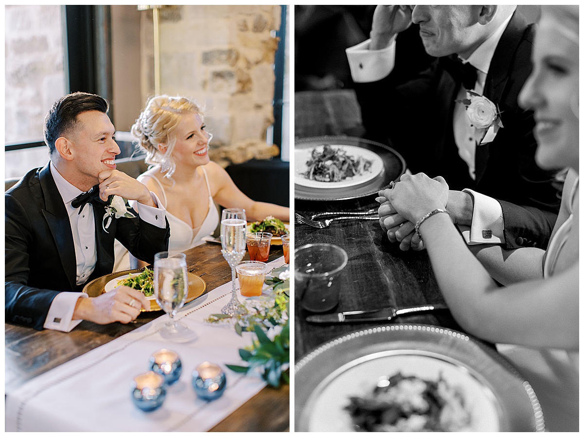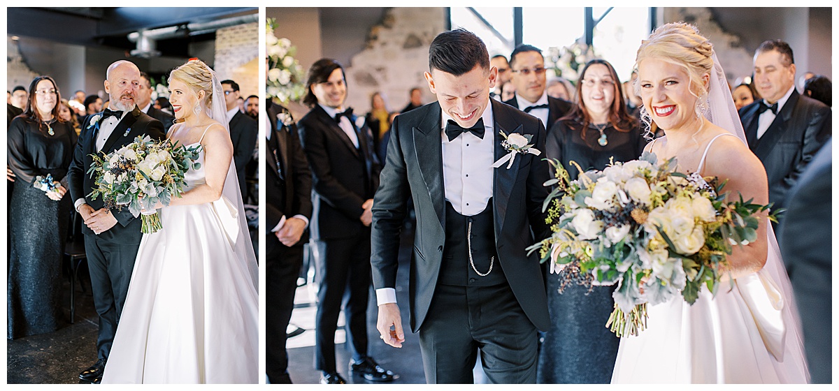 I have been fortunate to witness countless beautiful moments and unique settings that truly showcase the love and celebration of the couple’s special day. I had the pleasure of capturing Emily and Ray’s December wedding which took place in an exquisite industrial (with a touch of old-world charm) setting. With pops of navy blue, classic black and white hues, and gold statement pieces adorning the tables, this wedding was a perfect blend of elegance and modernity.